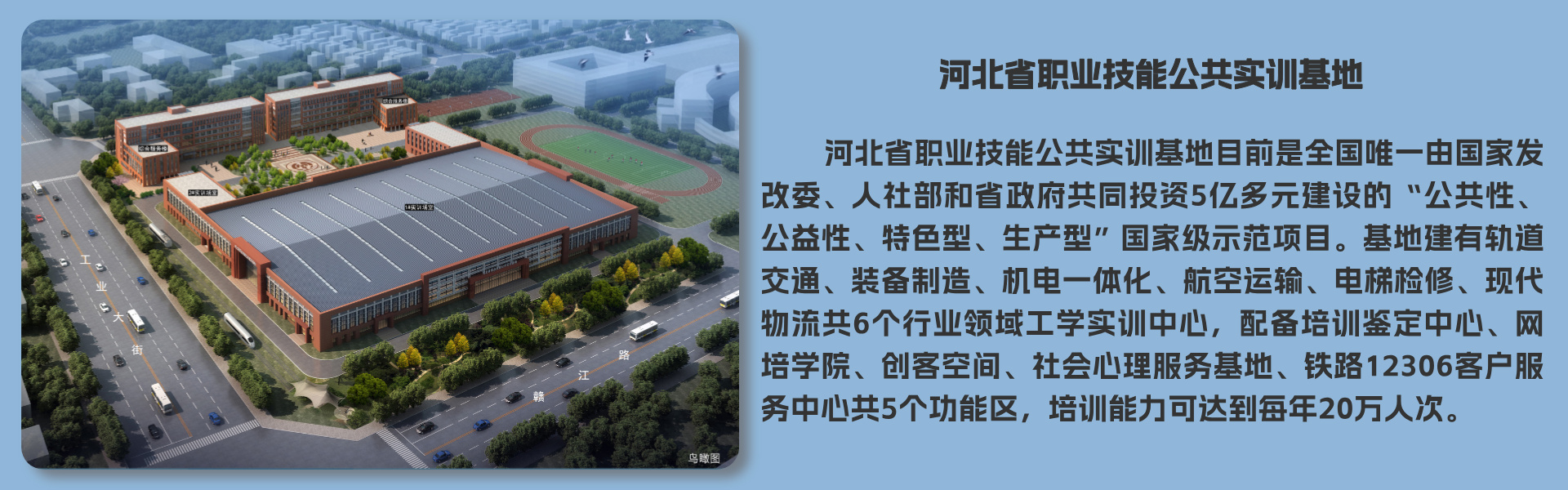 基地建有轨道交通、装备制造、机电一体化、航空运输、电梯检修、现代物流共6个行业领域工学实训中心,配备培训鉴定中心、网培学院、创客空间、社会心理服务基地、铁路12306客户服务中心共5个功能区。