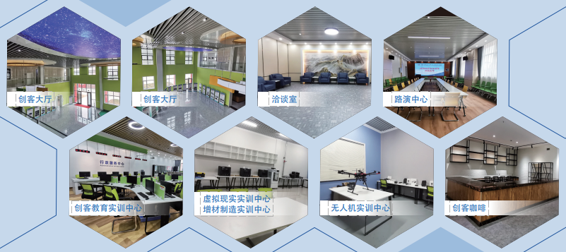 创客空间引入创新创业的先进理念,通过将各类资源整合在一个相互链接的场地中,形成服务 河北省职业技能公共实训基地的创新创业教育场所,总面积 1800 平方米,主要包括创客教育实训 中心、智能制造实训中心、虚拟现实实训中心、无人机实训中心、路演中心、洽谈室、创客咖啡等 区域,主要实训室 17 间,实训设备和软件系统 90 余台(套)。