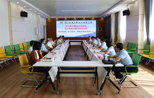 2021年6月3日上午,河北省交通职业技术学校校长邓秋立、副校长张泓及部分中层领导干部一行七人,到河北轨道运输职业技术学院交流学习考察。学院党委书记张晓辉、院长张澜锁、纪委书记陶辉、副院长赵矿英,以及党政办公室、招生和就业创业中心、教务处、城市轨道交通系、实训中心负责同志参加交流座谈。