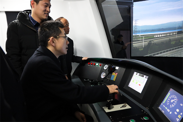张春生一行对河北基地进行了全面参观,重点考察调研了装备制造、机车车辆检修线、电梯检修、高端焊接、电工电子、12306客户服务中心、铁路旅服和城轨“三站两区间”等专业实训场(室)。在城轨车辆模拟驾驶实训室,张春生还饶有兴致地进行了车辆模拟驾驶的体验操作。