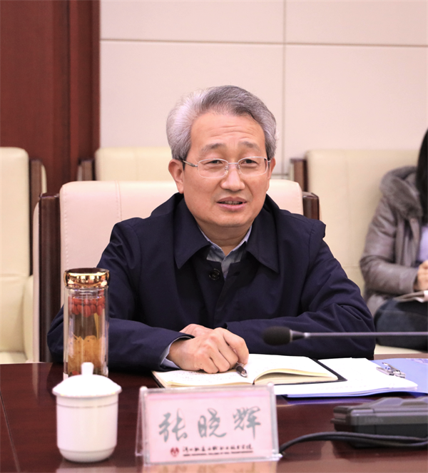 张晓辉就学院基本情况进行简要汇报,介绍2021年在党的建设、干部人才队伍改革、双高建设、教育教学成果、就业工作、高技能人才培养基地建设、办学架构、以赛促改促教促学、“双援(援疆援藏)”工作、社会影响力等方面的十项突破性成就并就学院办学条件、河北基地运行等方面存在的问题进行了总结和梳理。