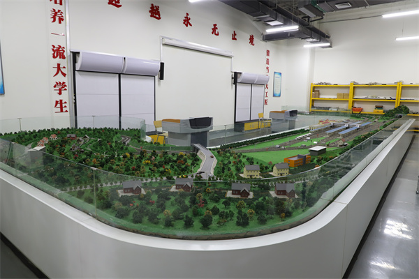 本实训室由一组工务轨道构造模拟沙盘、投影屏幕、教员控制台、网络柜等系统组成。工务轨道构造模拟沙盘是模拟铁路轨道日常维修作业标准、大中修施工流程、安全防护设置、劳动力组织可视化实训设备。